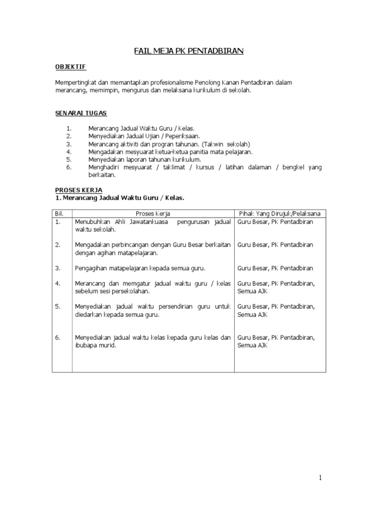Mengadakan mesyaurat jawatankuasa kurikulum dan menyediakan bajet. Sebelum ini semua pelantikan perunding sama ada bagi projek pembangunan fizikal mahupun kajian. This is majlis perpisahan pk pentadbiran dan pk hem sk guar jentik by unit media skgj on vimeo, the home for high quality videos and the people who love… majlis perpisahan pk pentadbiran dan pk hem sk guar jentik. Selaras dengan keperluan ini, fail meja dijenamakan semula sebagai myportfolio bagi memberikan gambaran menyeluruh terhadap bidang tugas serta tanggungjawab sesuatu jawatan dan agensi. Tuan haji mohd shukri bin haji ghazali penolong kanan pentadbiran sk kampong kedah, parit buntar. Fail meja pk hem guru yang memperincikan tugasan setiap jawatan dan tanggungjawab guru di sekolah. Fail meja ini perlu dikaji & dikemaskini oleh ketua jabatan jika: Fail meja pengetua sekolah menengah agama rompin. 21 fail meja konsep 22 fail meja elemen 23 1. Fail meja bukan hak sendiri, mesti diletakkan di atas meja. Kerajaan malaysia pekeliling kemajuan pentadbiran awam. Ucapan pengarah jabatan pendidikan negeri johor. Merancang aktiviti/takwim setiausaha program spi bil 10/1993 pk kurikulum 5.